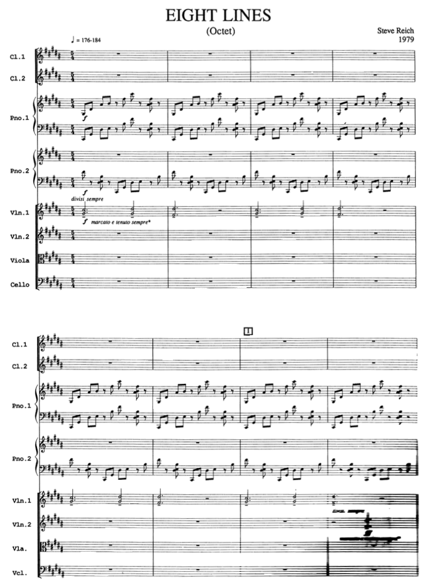 For comparison, let's pick a highly admired piece by Steve Reich (also, I happen to have the score!), the octet titled "Eight Lines" from 1979/1983. This is the original recording from 1979 by Steve Reich and Musicians: